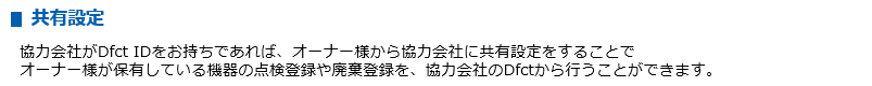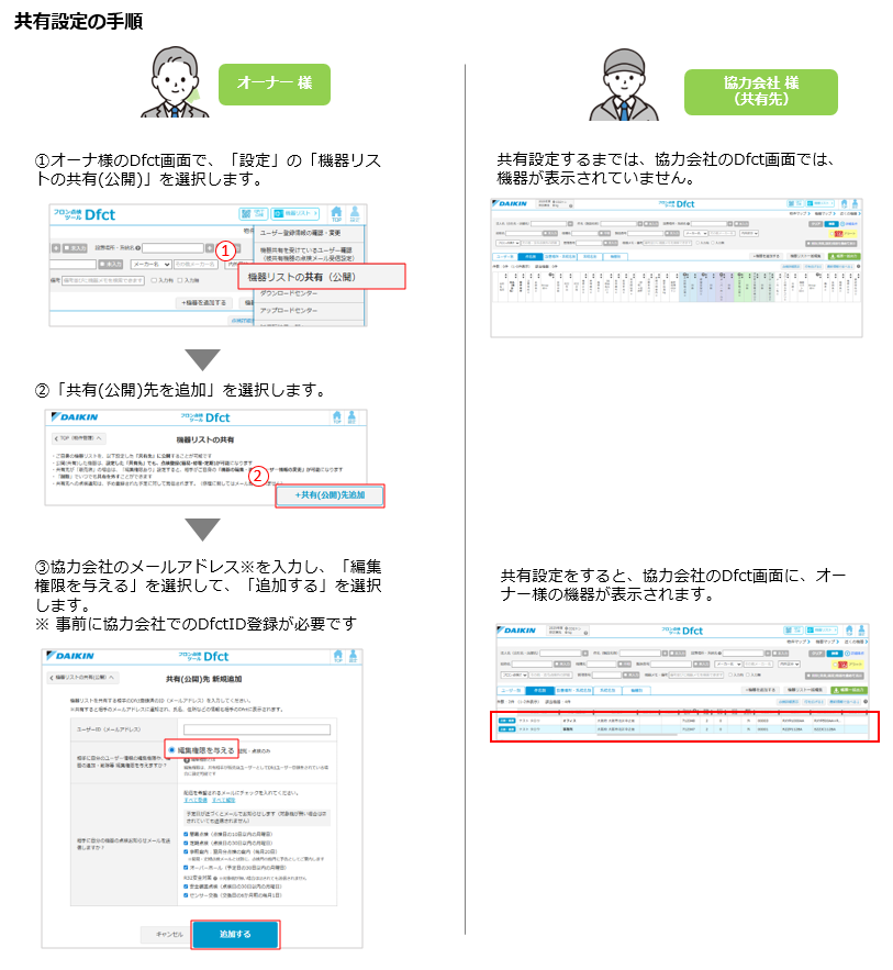 お客様からの「機器リストの共有(公開)」時に、共有する相手先にご自身の「Dfct編集権限」の有無が設定頂けます。