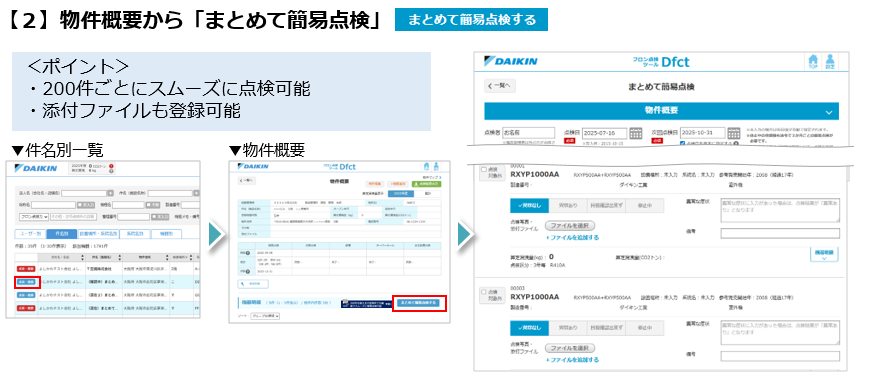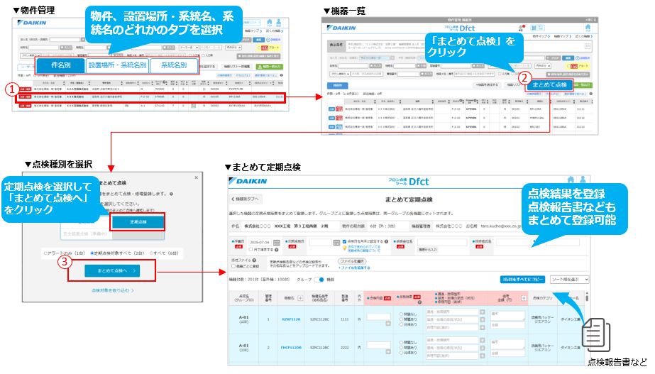 「機器一覧」や「物件概要」に表示されますが「まとめて簡易点検」操作時、