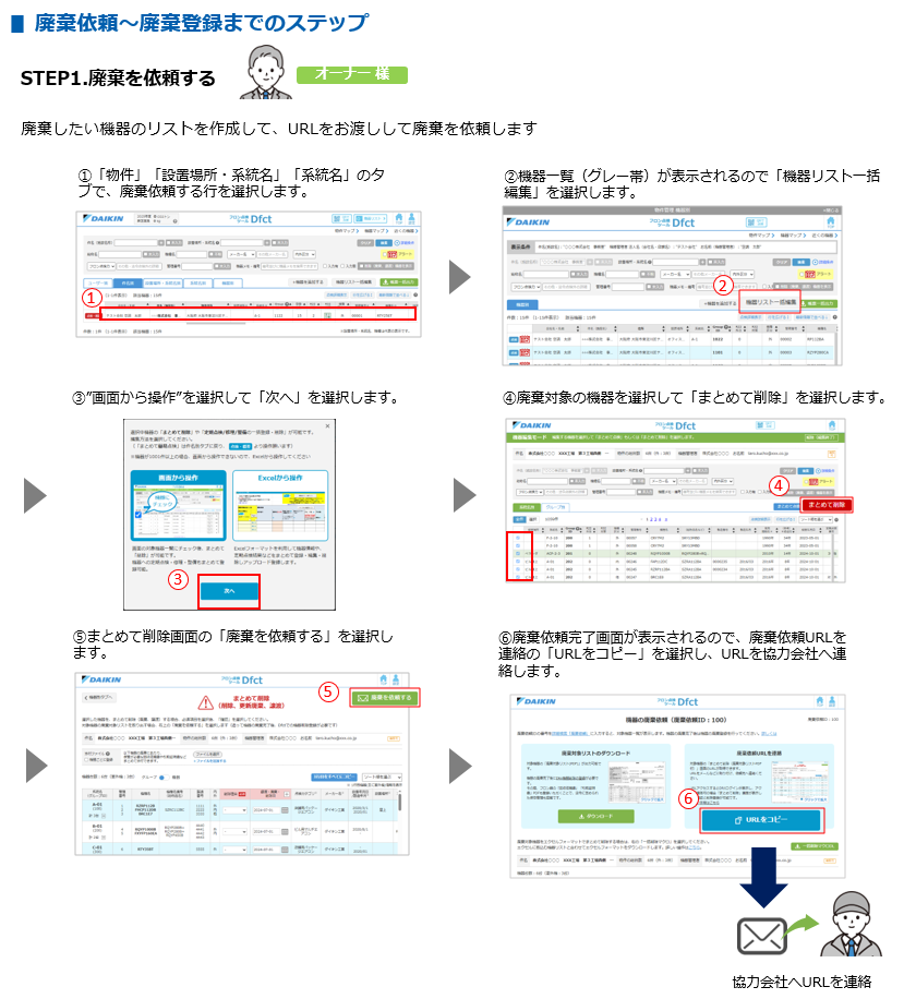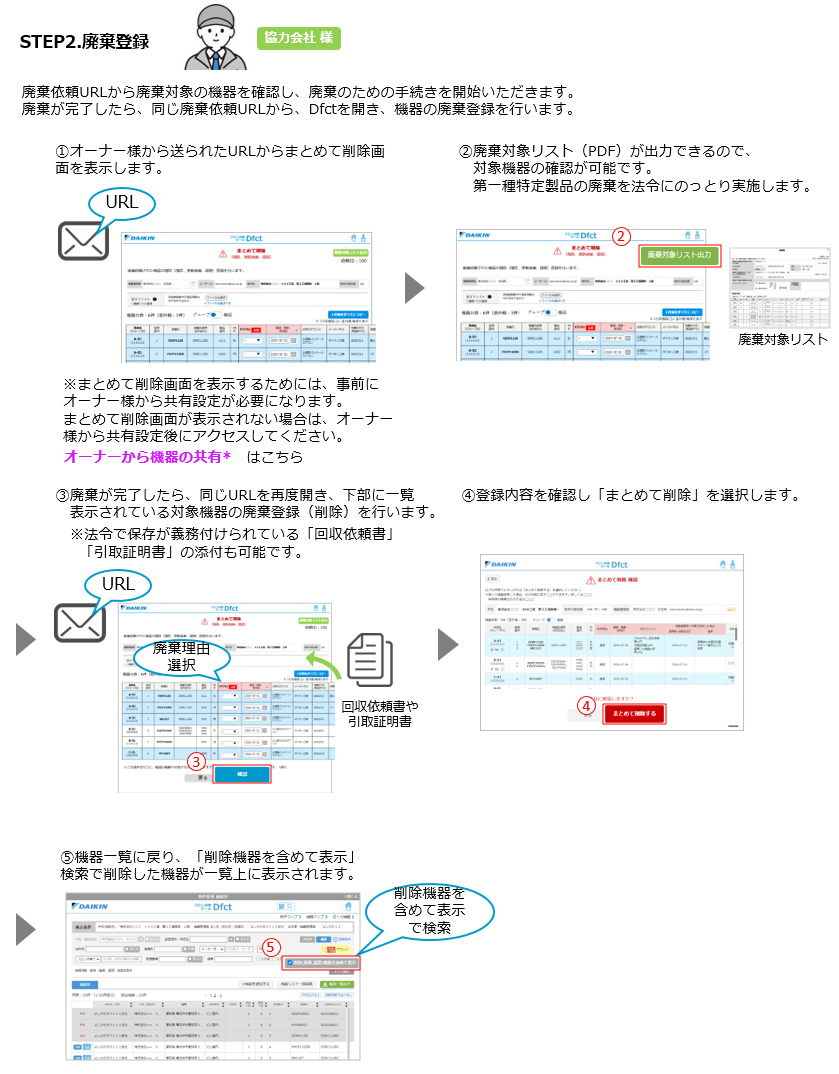 機器の納入・引渡しタイミングでのフロン排出抑制法 説明の際、Dfctを利用して法令に定められている簡易点検などオーナー義務をご案内したい、といった販売店様のニーズに対応し、事前にお客様のDfct環境設定が行える「顧客管理機能」をリリースしました。