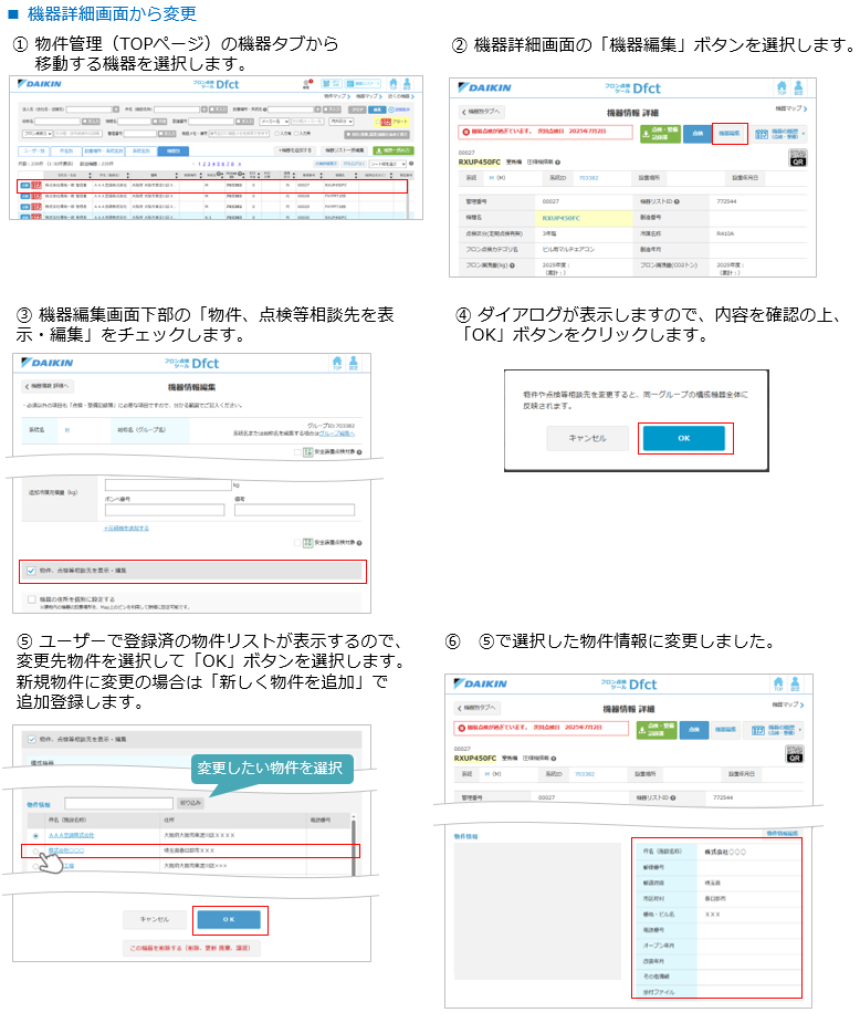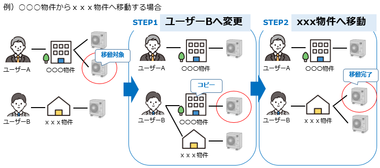 Q9-2:機器の点検履歴等を引き継いで、ユーザーと物件を変更するをご参照ください。