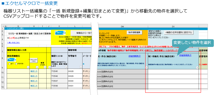 ダウンロードしたエクセルファイルを開きシート「まとめて更新用CSV作成_機器情報」から、出力したCSVファイルを読み込みます。「新)移動先件名」で移動させたい物件を選択し、更新用のCSVファイルを作成してください。