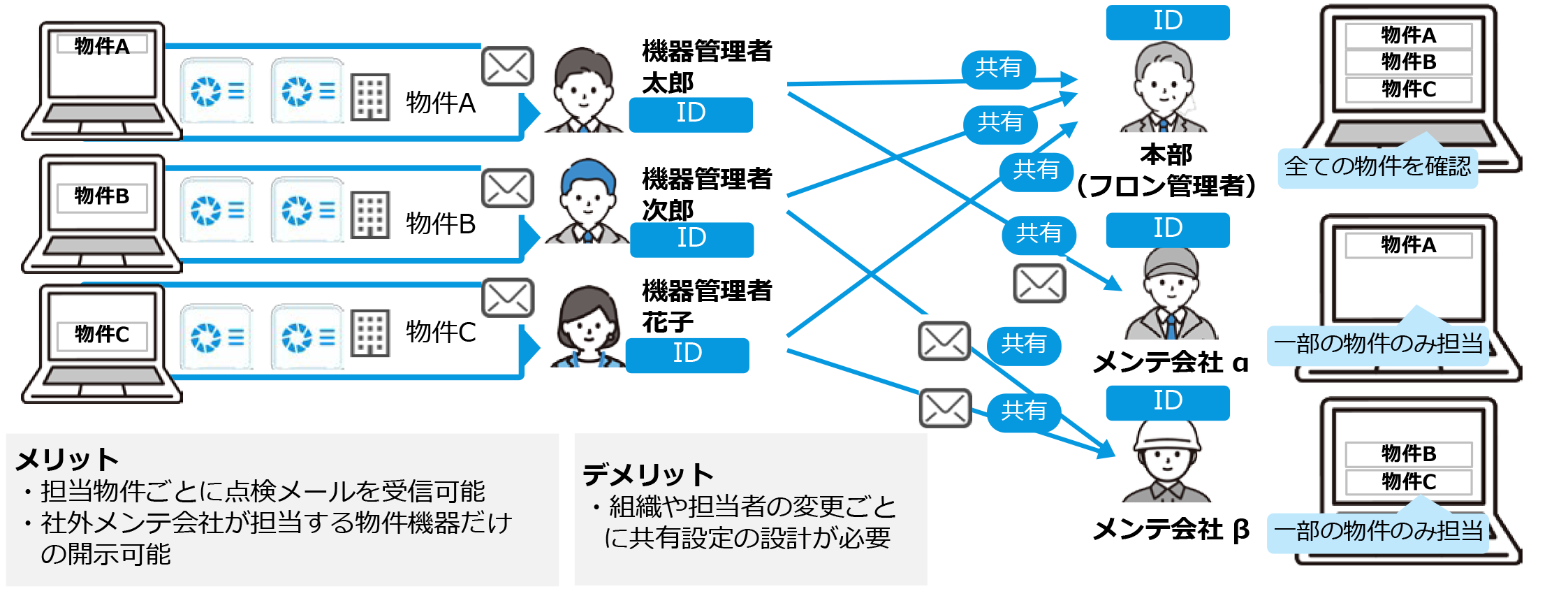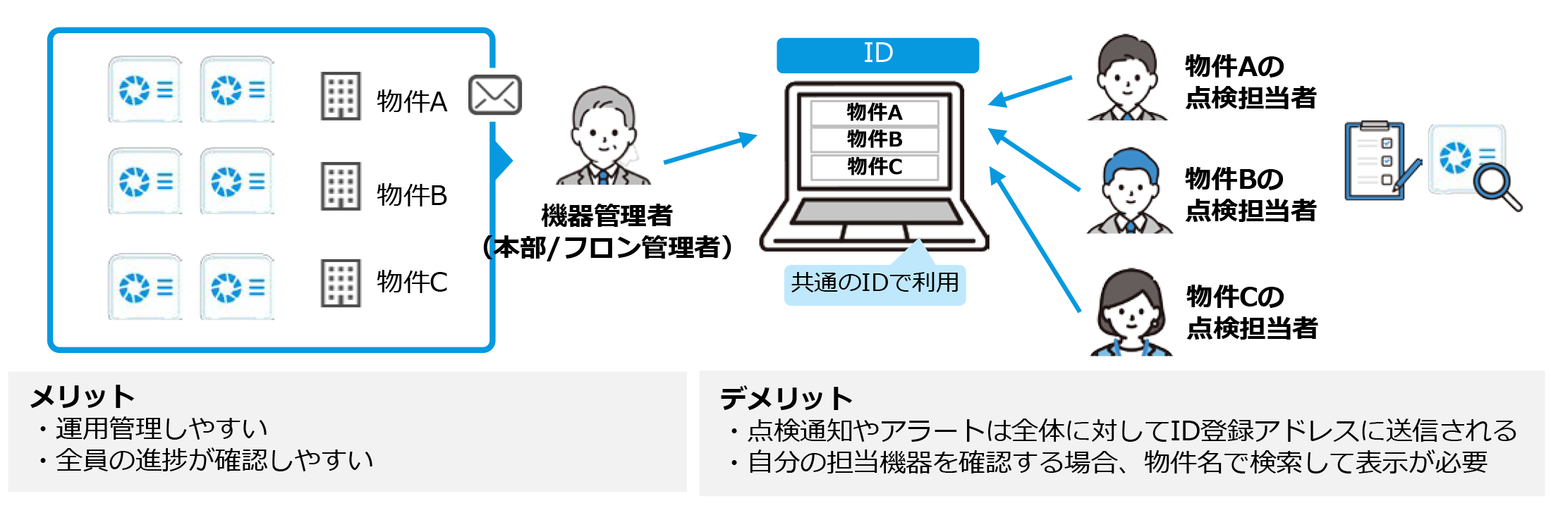 シンプル管理)法人で1つIDを利用。物件を利用して現場担当者が機器の点検管理を行う