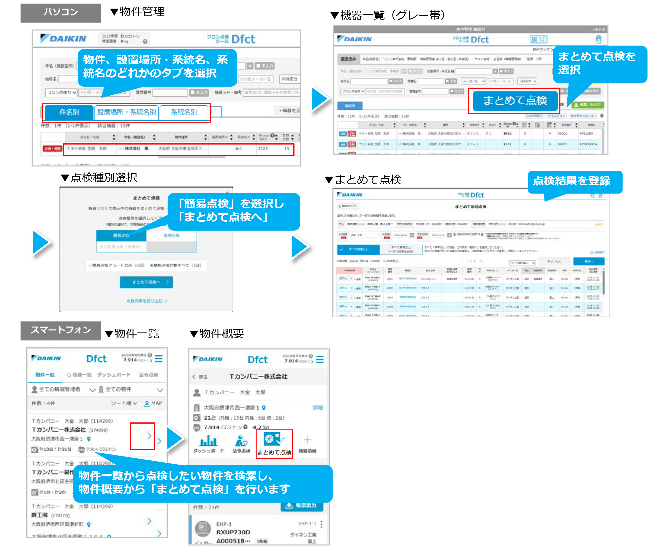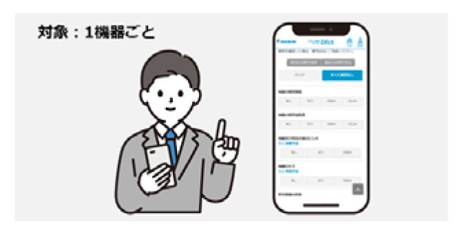パソコンの場合、件名別や系統別タブから対象行の選択で、物件内や系統内の機器が一覧表示し、物件や系統ごとの対象機器に対し、簡易点検の結果をまとめて登録が可能です。