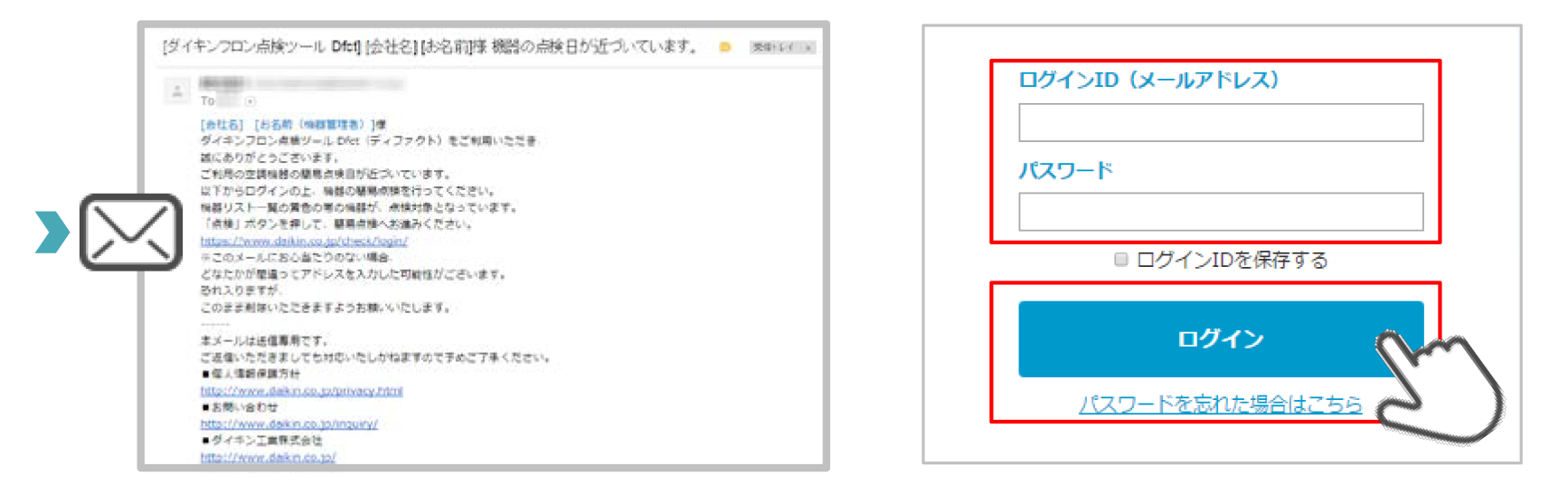 1 点検日の約10日前の月曜日に点検お知らせメールが届くので、Dfctへアクセスし、ログイン