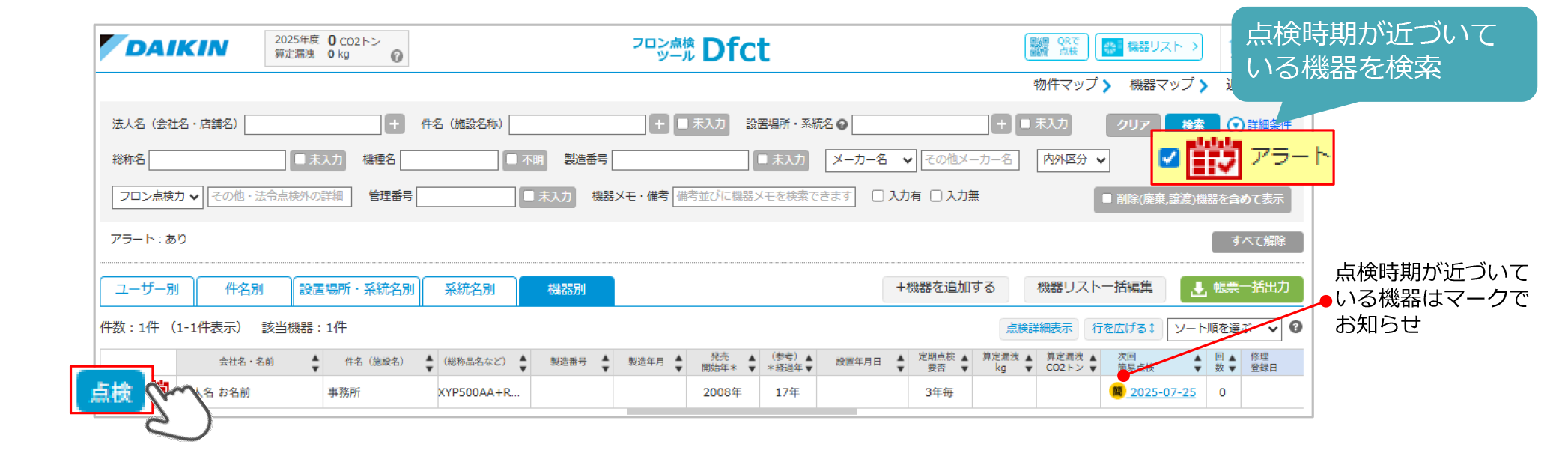 2 点検対象機器を検索して、「点検」をクリック