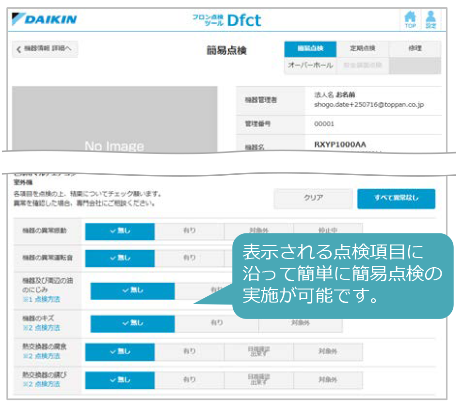 該当機器ごとに点検項目が表示されるので、機器情報の詳細や点検項目を確認しながら点検登録が可能です。