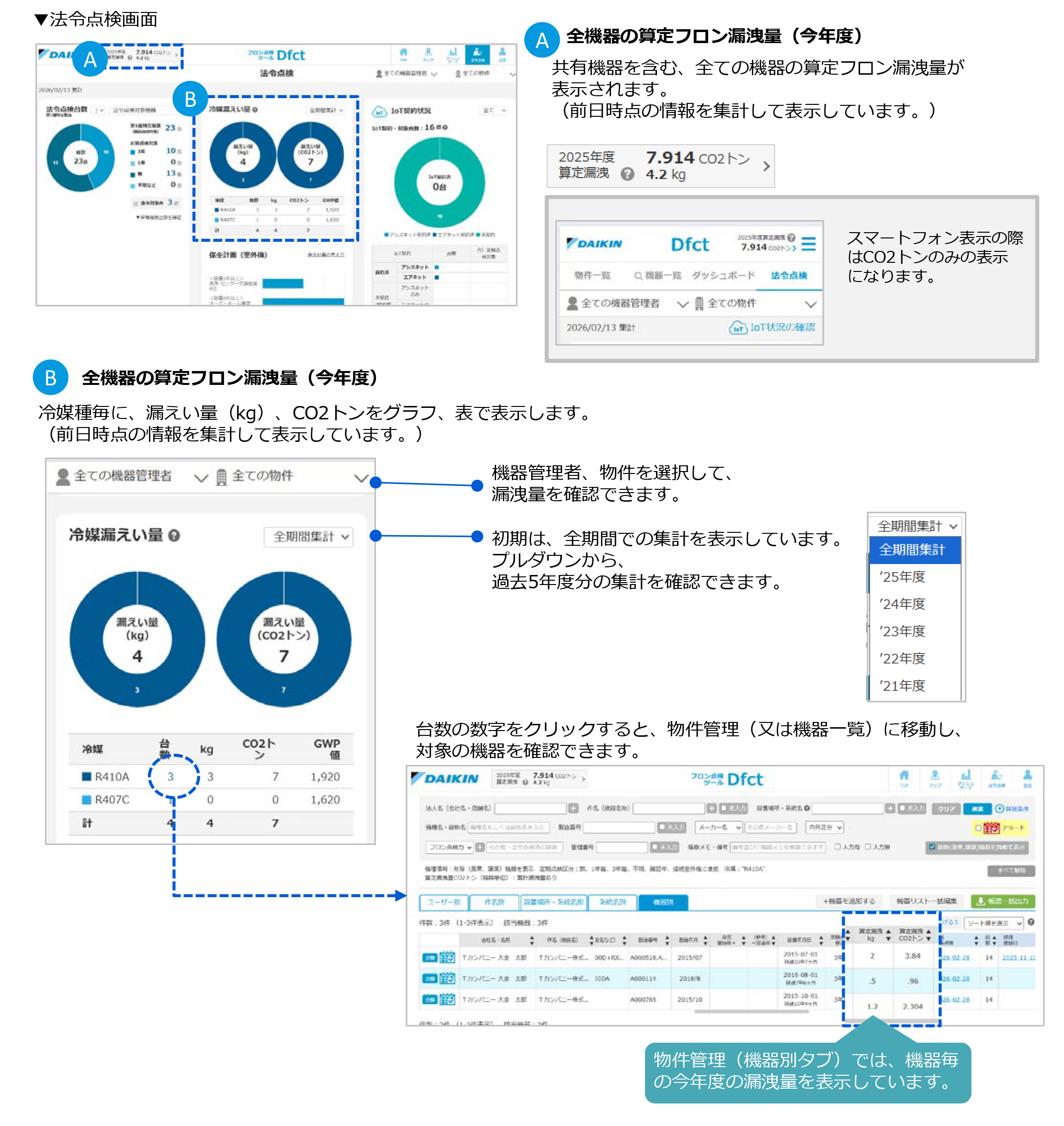 ヘッダ部分と法令点検画から、算定フロン漏洩量を確認します。