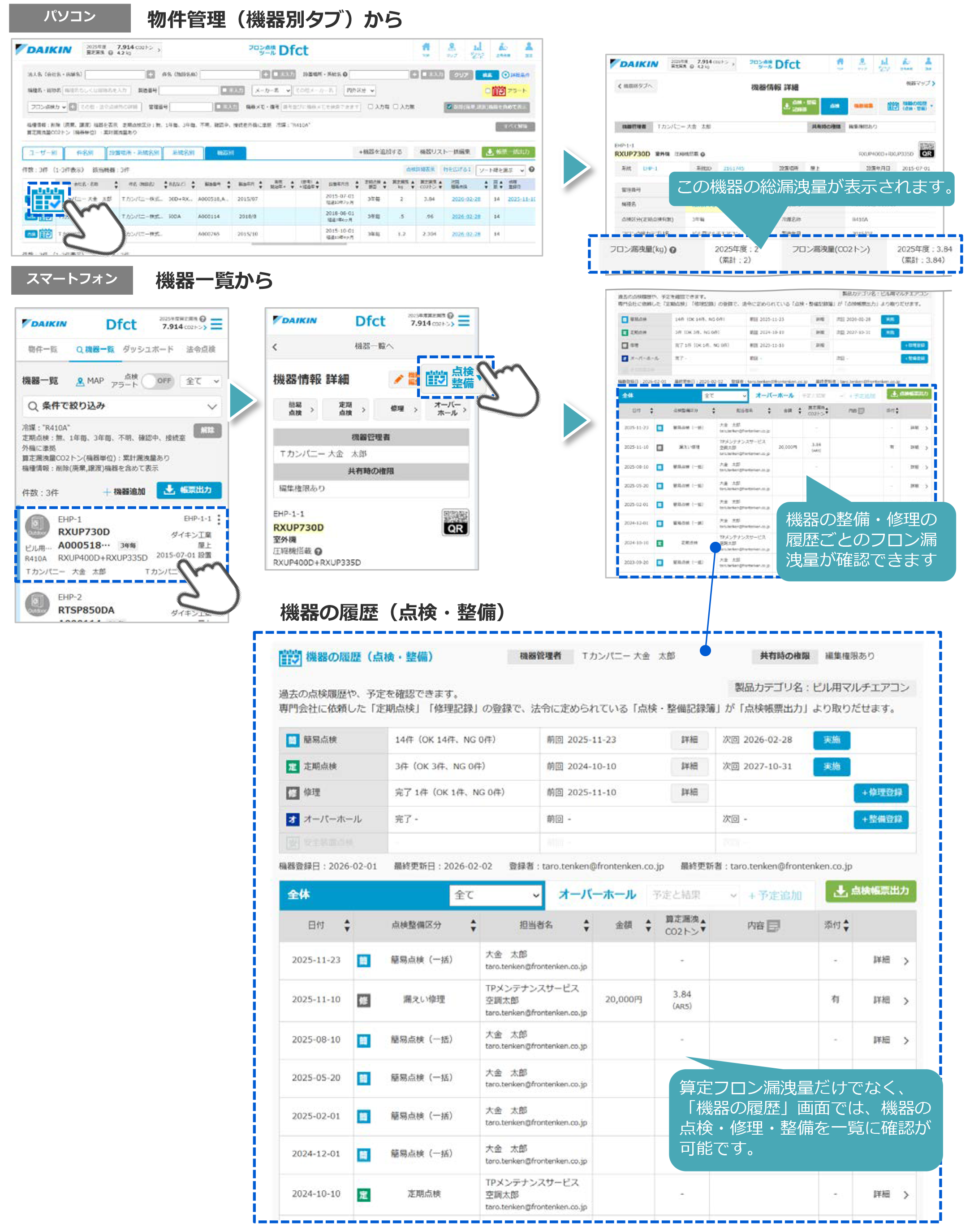 機器の詳細画面から、機器毎、点検・修理・整備の際の漏洩量を確認できます。