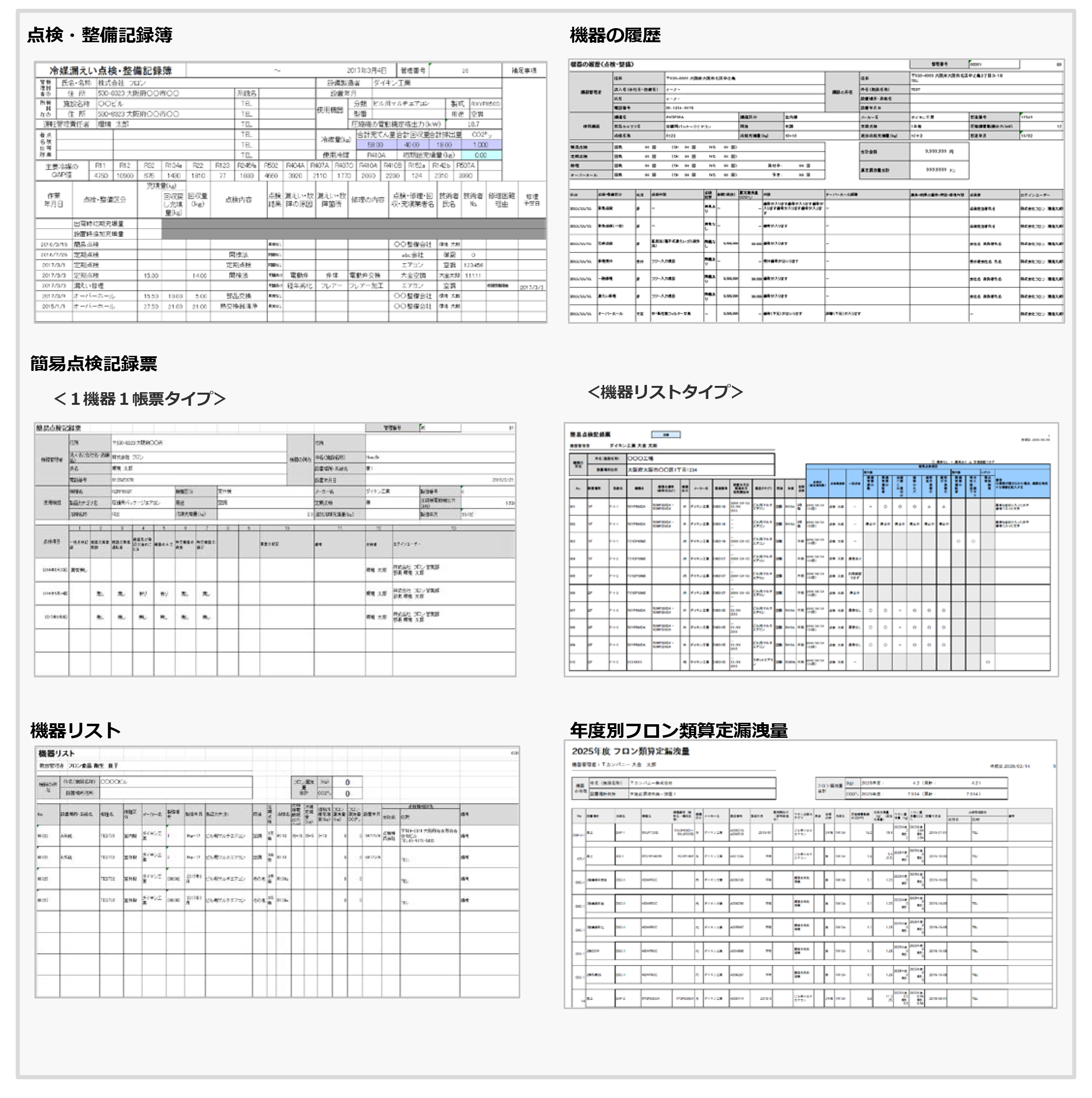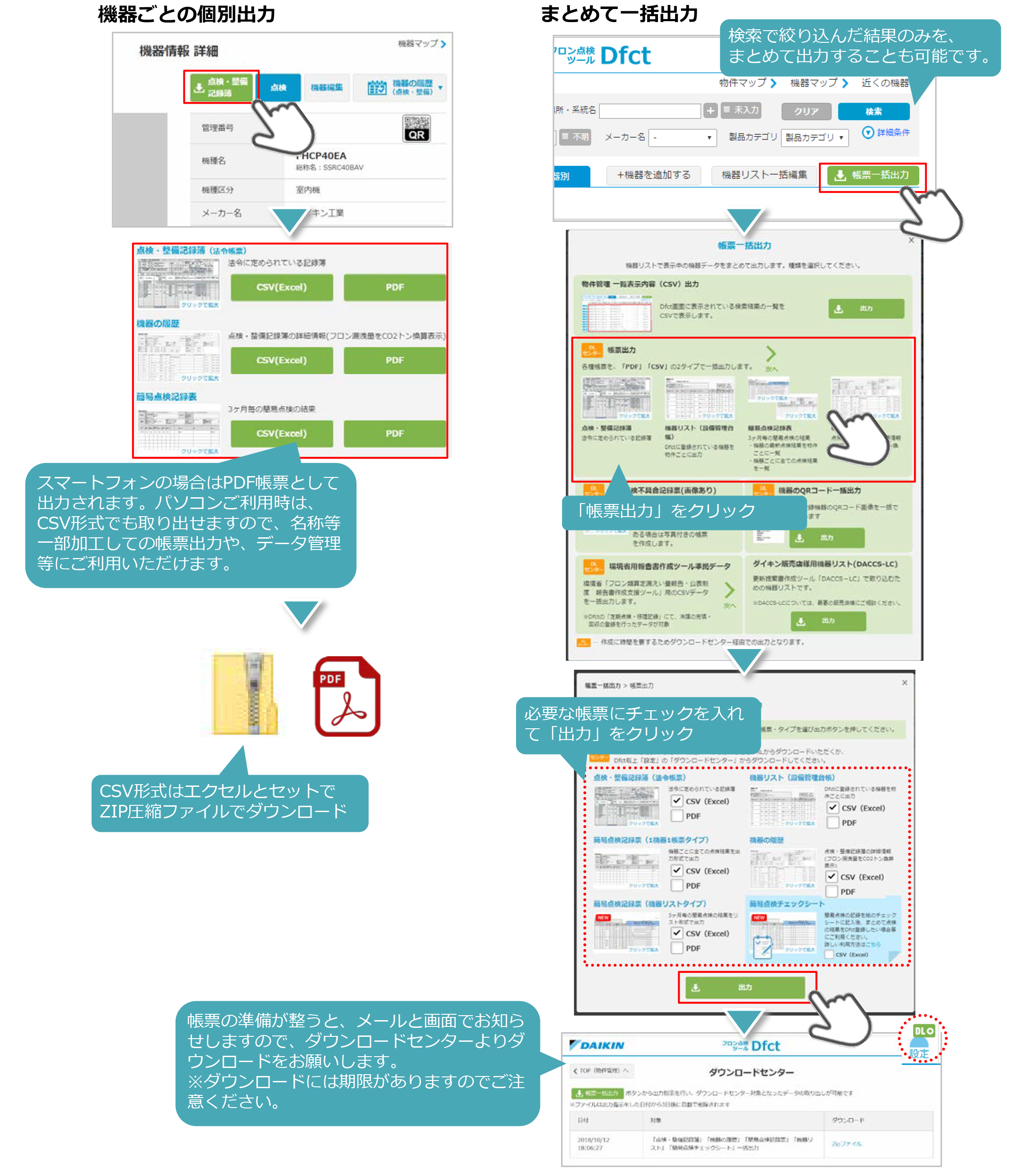 機器ごとの個別出力や、物件名や機種名等で絞り込んだ機器をまとめて出力が可能です。また、法令に定められた「点検・整備記録簿」含め、「機器の履歴」「簡易点検記録票」「機器リスト」をまとめて出力することも可能です。