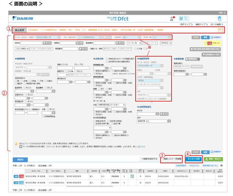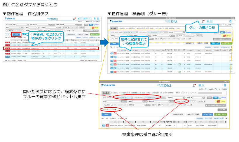 各タブ(「ユーザー別」「件名別」「設置場所・系統名別」「系統名別」)から機器の行をクリックすることで、対象の物件や系統に含まれている機器の一覧を表示します。一覧表示の際、各タブ画面で検索した条件はクリアせずに、引き継いで表示します。