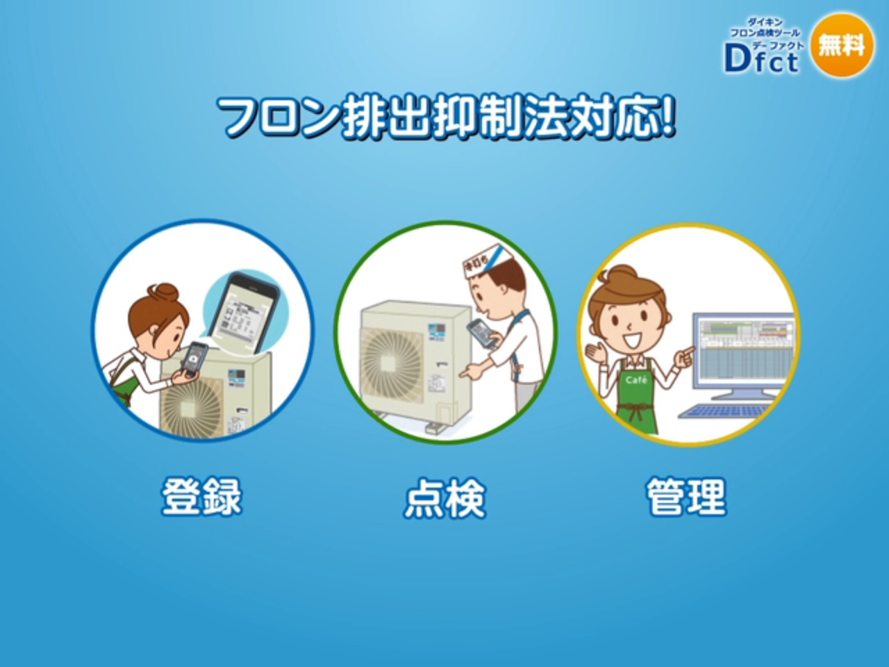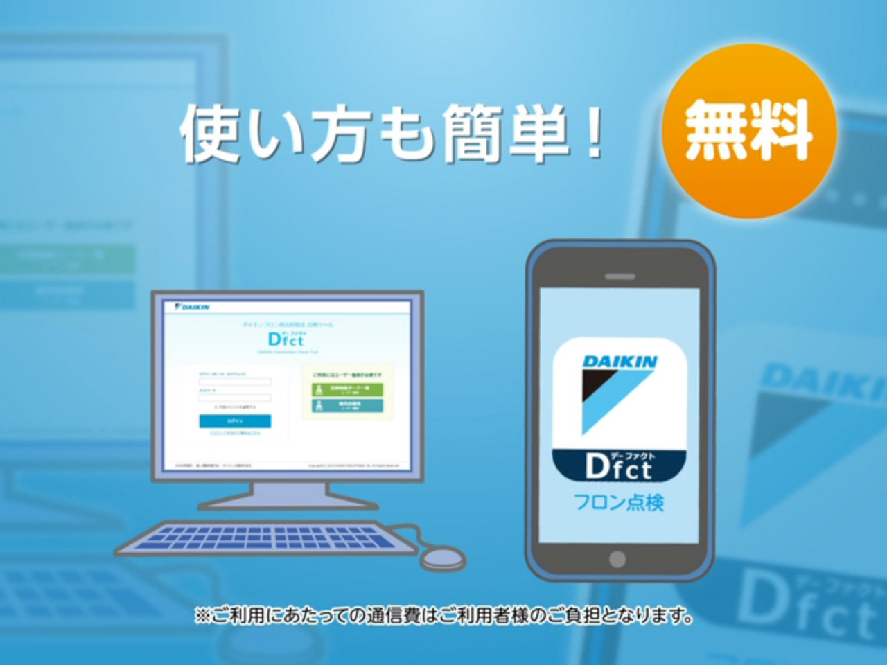Dfctはフロン排出抑制法で業務用空調機・冷凍冷蔵機の管理者様に課せられる「機器の点検」「点検整備記録の保存」「フロン漏えい量の算定と報告」などの法令対応を無料でサポート。パソコンでもスマートフォンでもご利用いただけます。(約4分) |