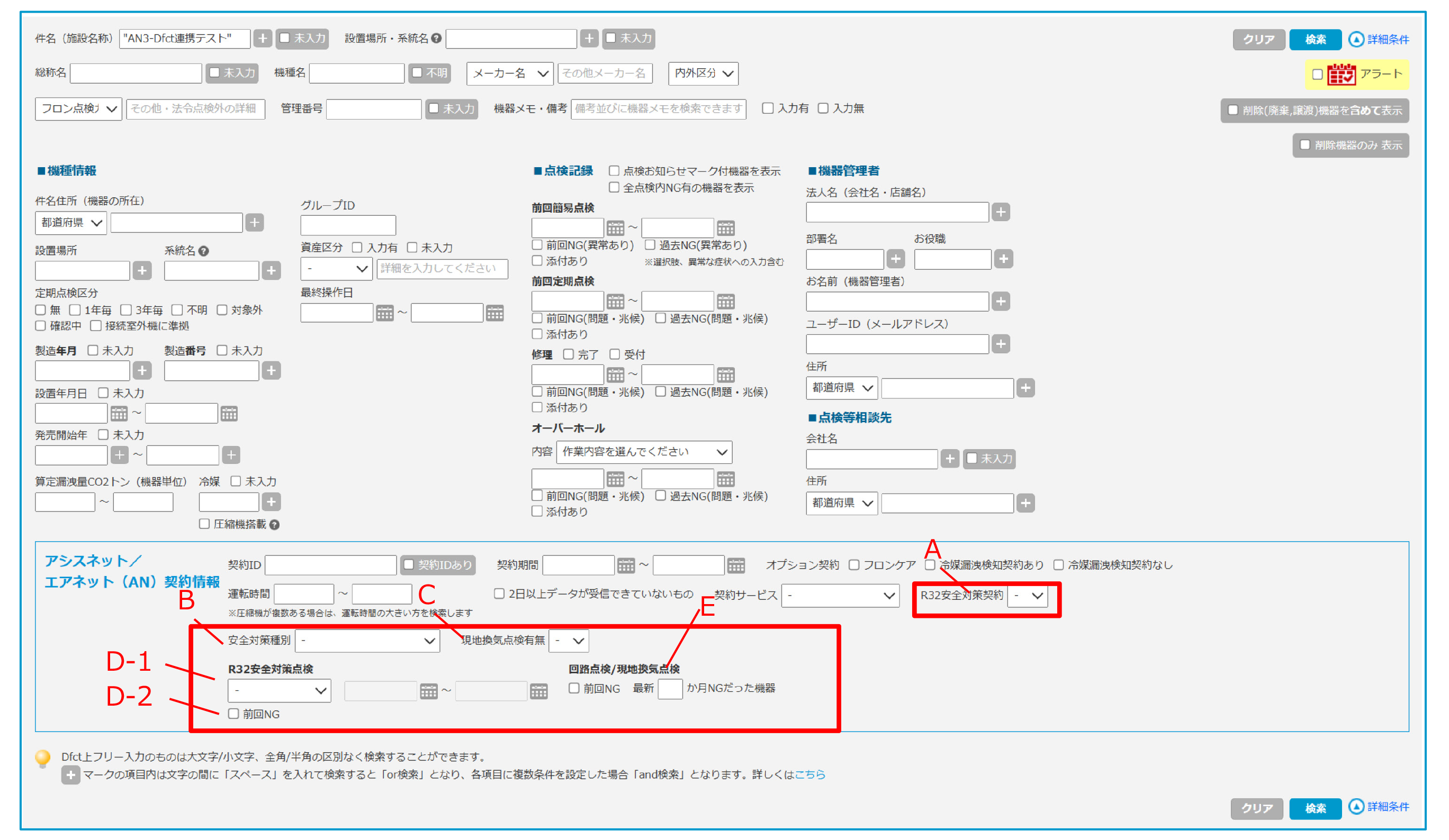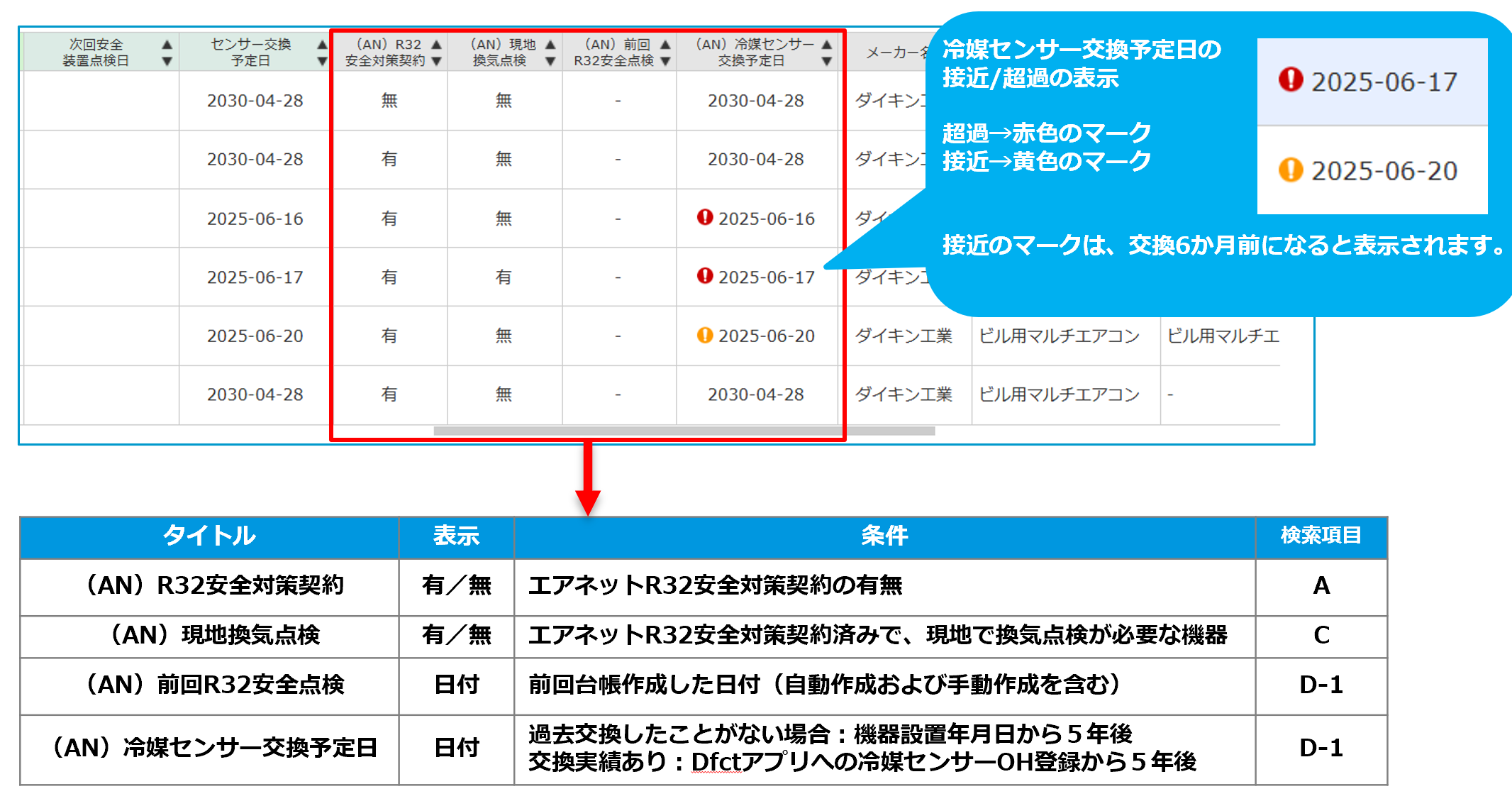 D-1)R32安全対策点検の点検実施日、もしくは冷媒センサー交換予定日から機器を探す