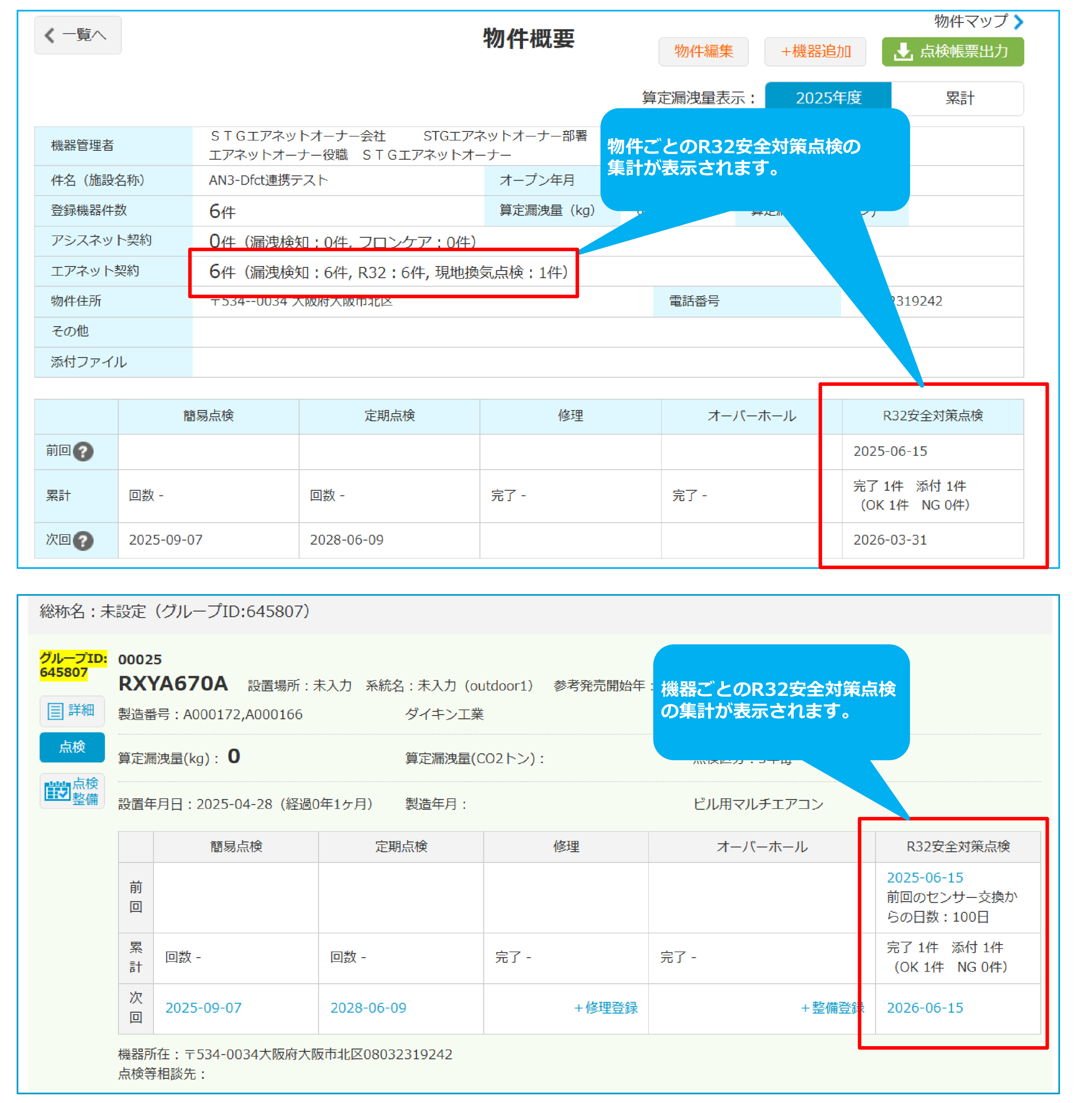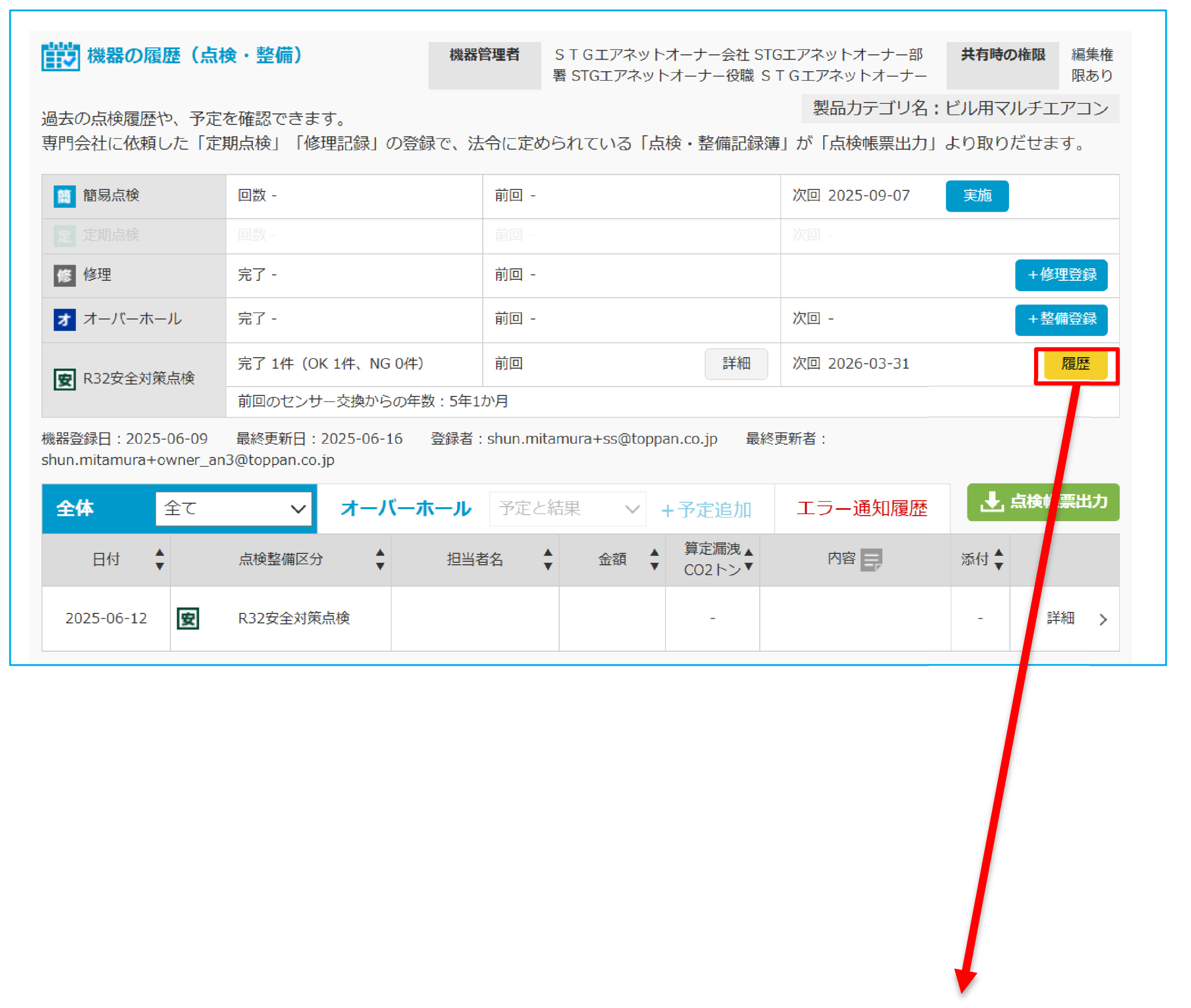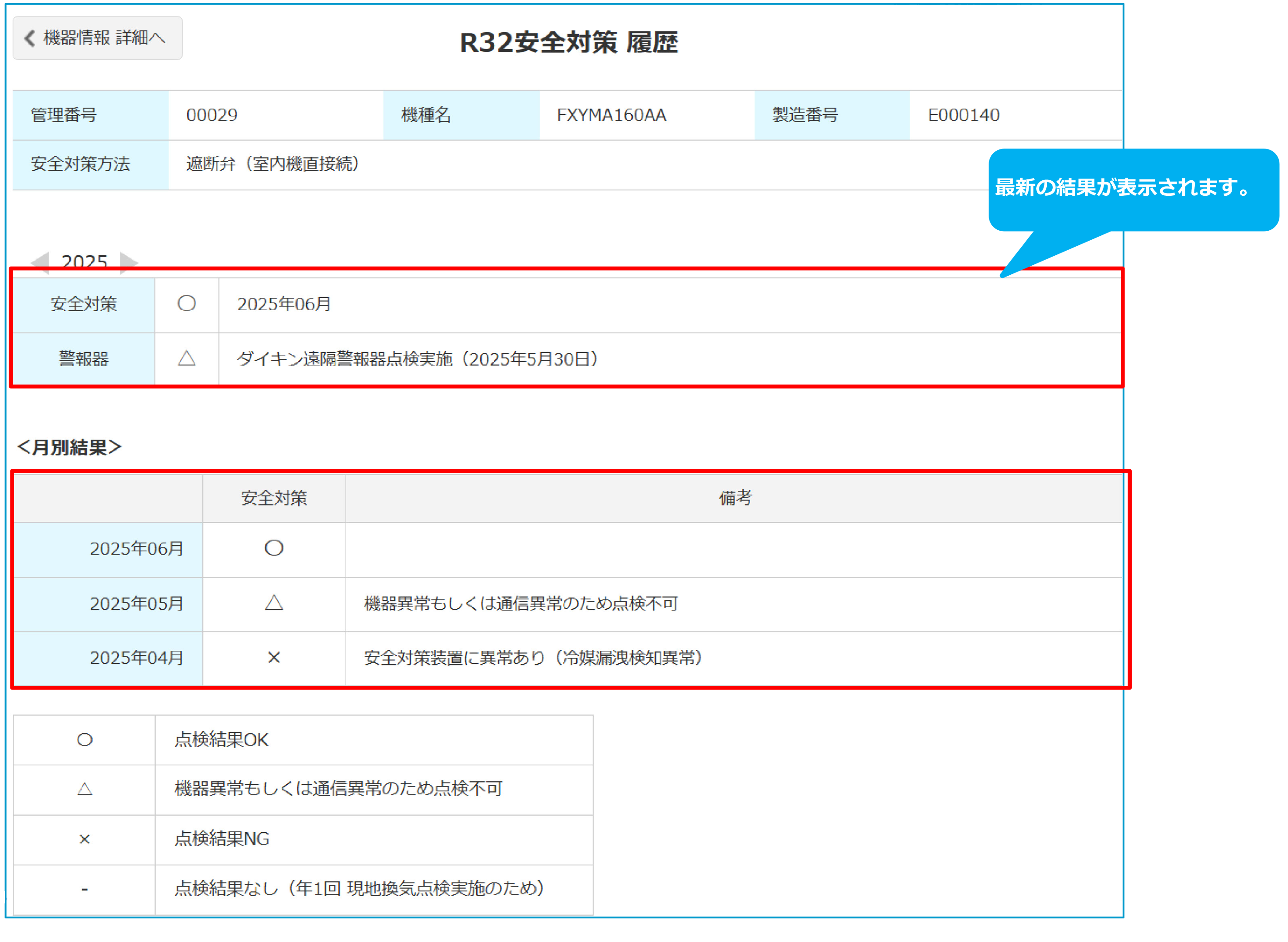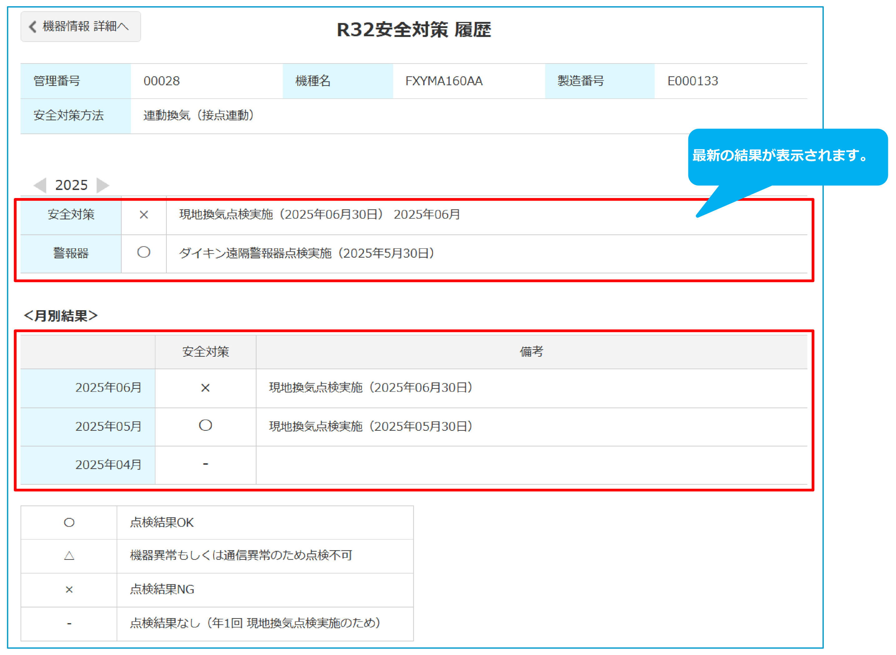 R32安全対策点検の結果履歴の詳細を確認できます。