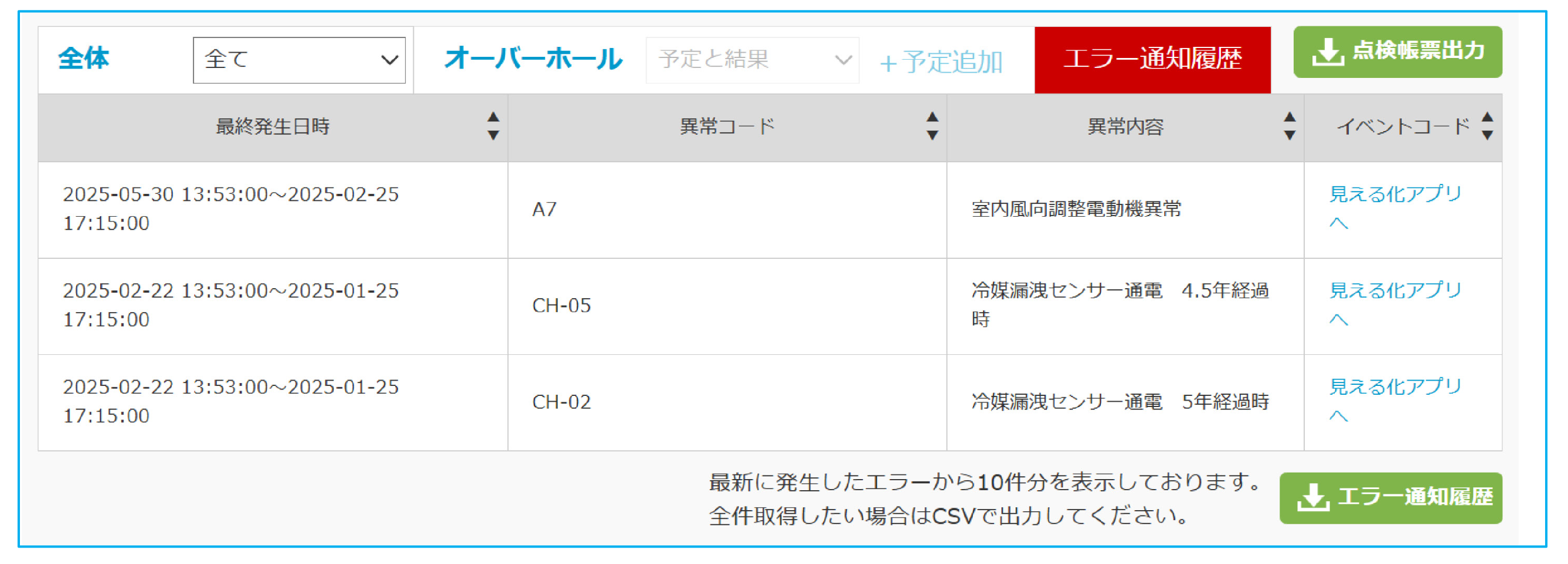 機器詳細の下部にあるエラー通知履歴から確認することができます。(一部のエラー内容に限る)