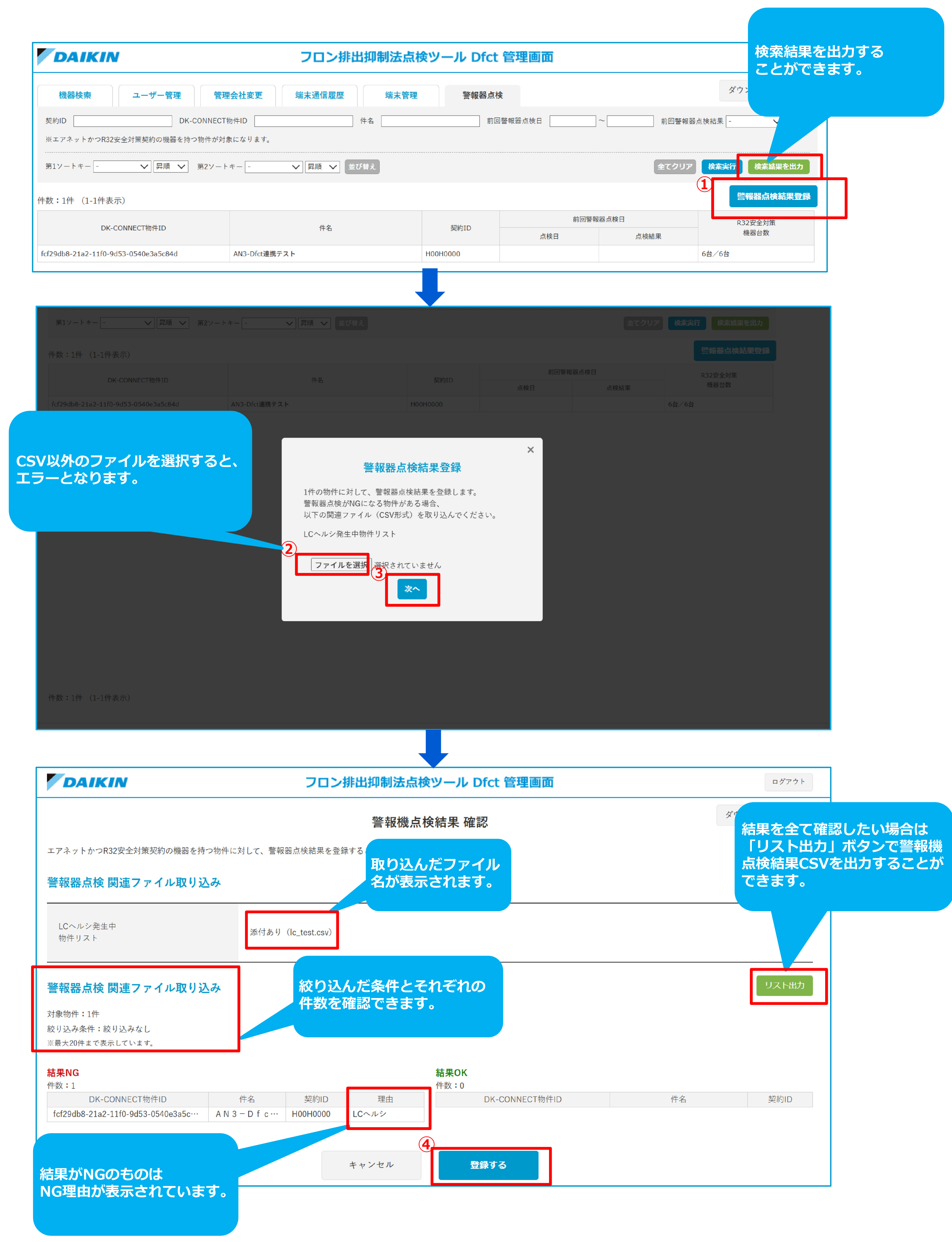管理画面から、ファイルをアップロードして警報器点検結果を登録できます。