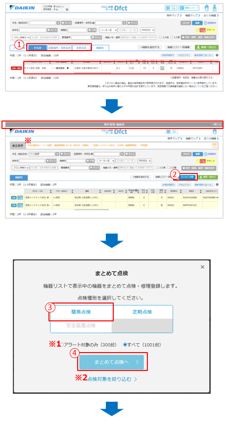 - ※1 点検お知らせ表示(アラート)が出ている機器のみ点検する場合は「アラート対象のみ」を選択ください。