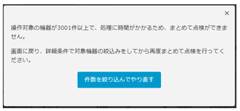 - ※対象機器が3001件以上の場合、まとめて点検ができません。以下のダイアログが表示しますので、「件数を絞り込んでやり直す」を選択して対象機器を絞込みをしてから再度まとめて点検を行ってください。