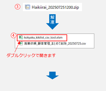 - 「Haikiirai_YYYYMMDDhhmm.zip」というzipファイルがダウンロードされます。