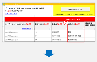 - 「まとめて削除用CSV作成」シートが開き、廃棄依頼した機器の情報が埋まります。