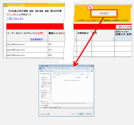 - 「入力が完了したら、「CSV出力」ボタンを押してください。保存先のフォルダとファイル名を指定してCSVを保存してください。
