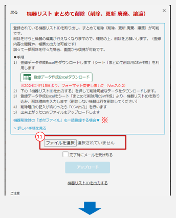 「機器削除時の「添付ファイル」も一括登録する場合」(※)をクリックし、以下の手順でアップロードを行ってください。- a. 7.で保存したCSVファイルを選択