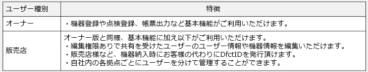 ユーザー種別の違いは、ユーザー種別のオーナーと販売店の違い を参照ください。