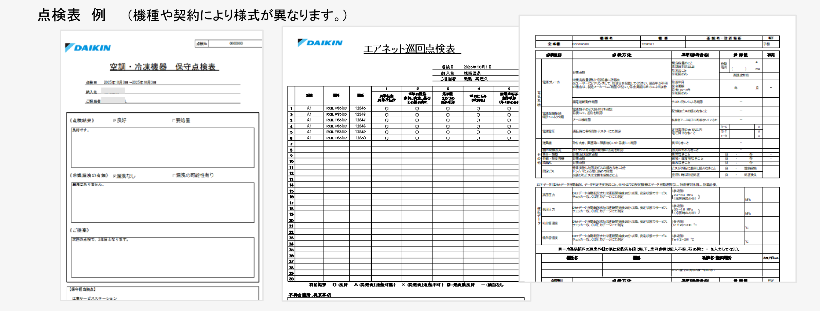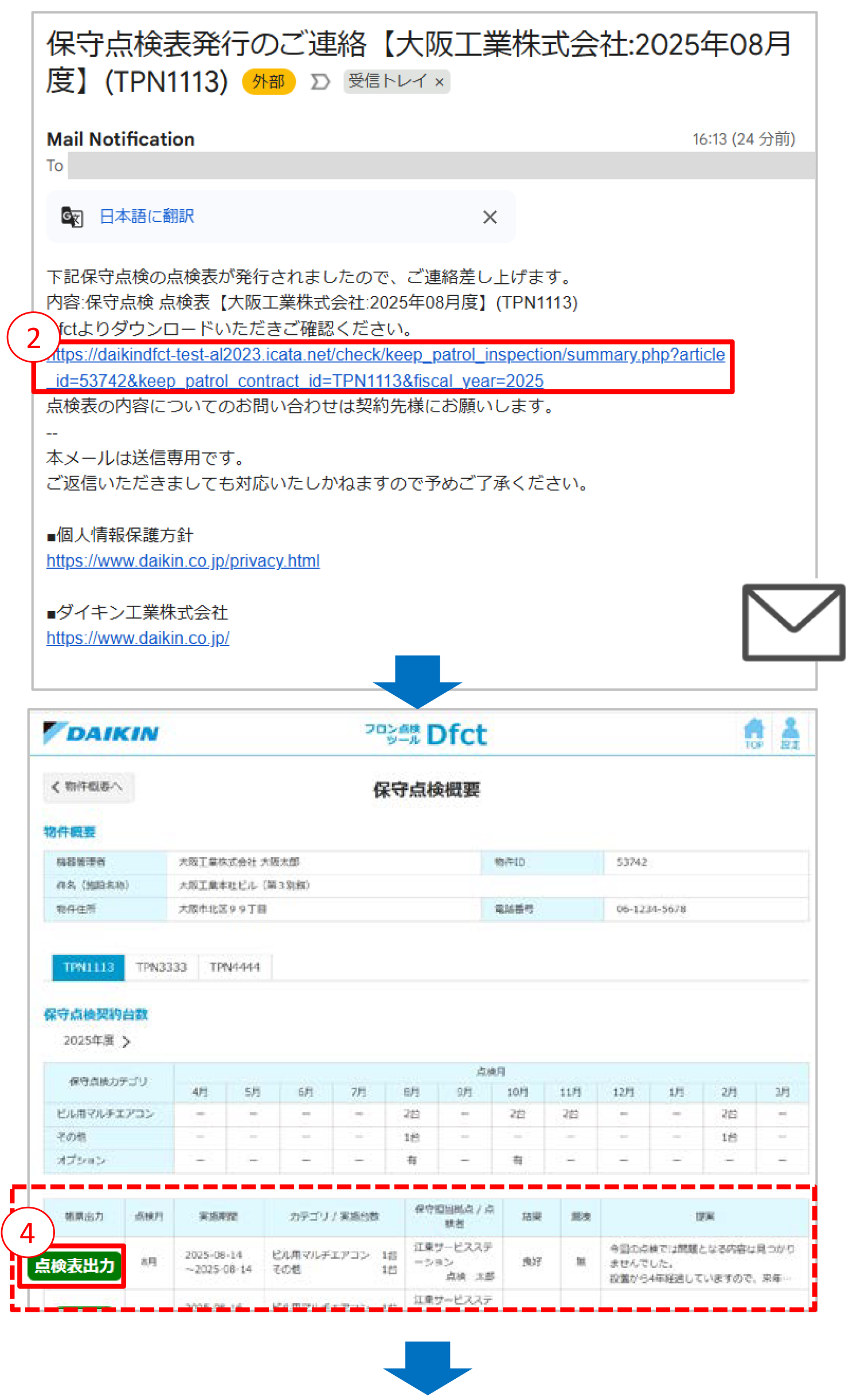 - 「保守点検表発行のご連絡【(会社名)XXXX年XX月度】(契約ID)」という件名で届きます。