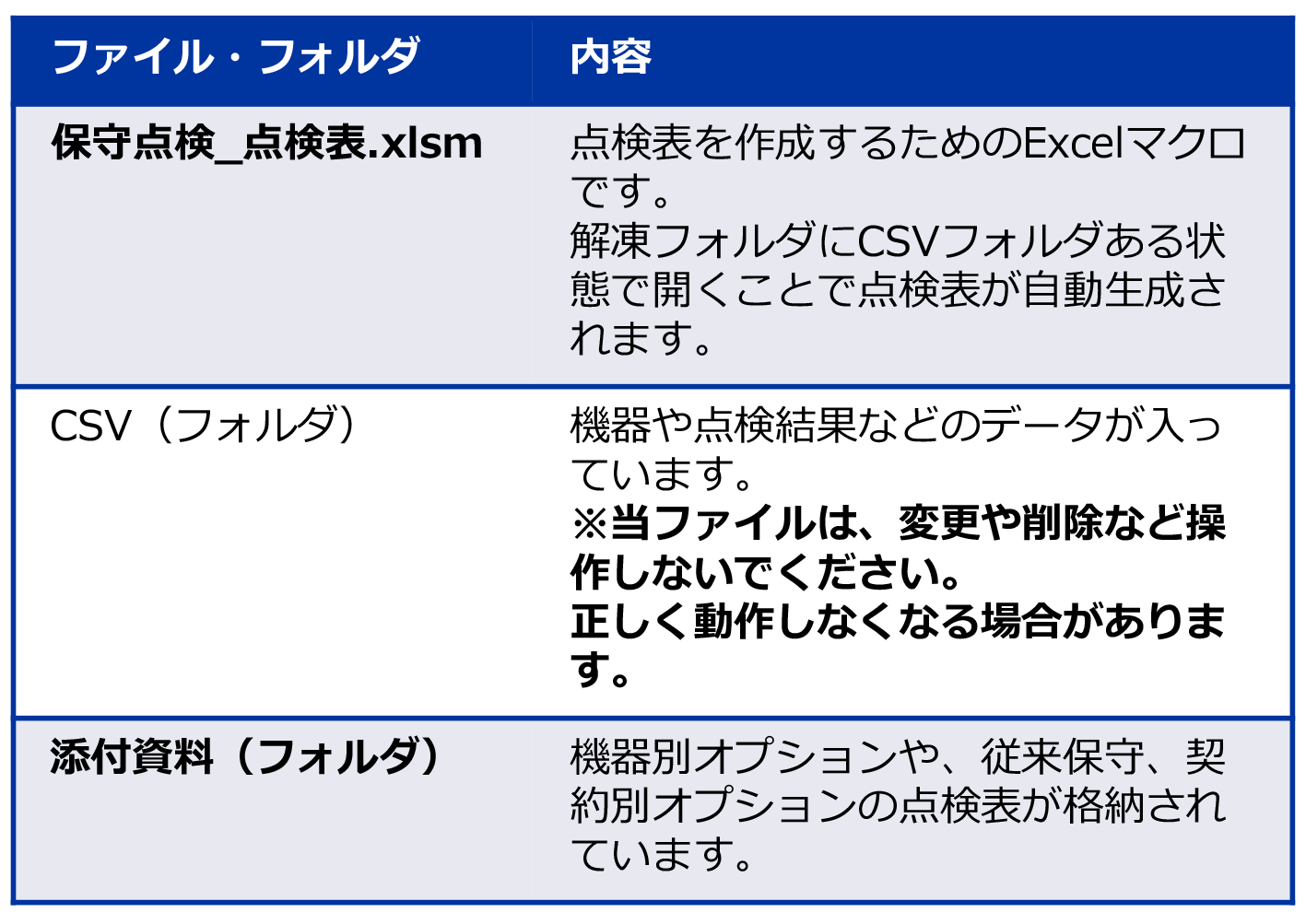 - オプション契約の点検資料やその他添付資料は、解凍フォルダ内の「添付資料」ファルダの中を確認してください。
