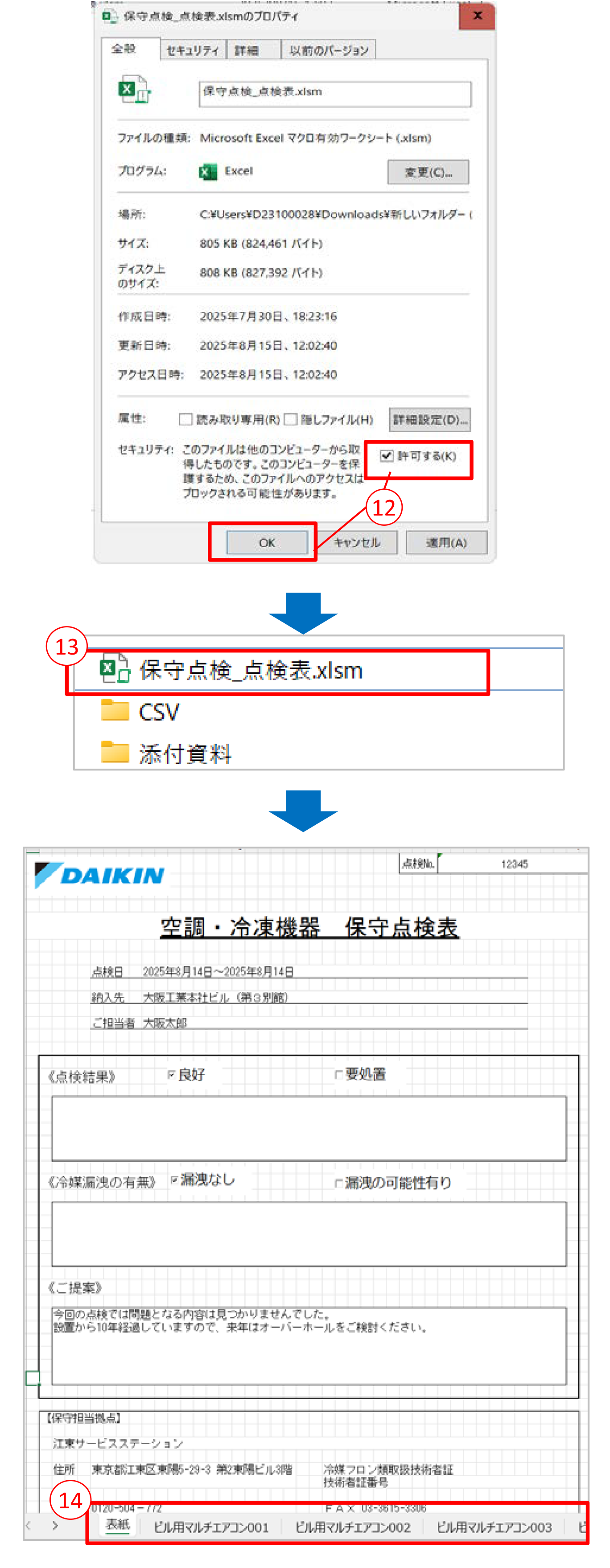 - 解凍したフォルダ内のExcel(保守点検_点検表.xlsm)は、Windowsのセキュリティでブロックされて利用ができませんので、設定を変更します。